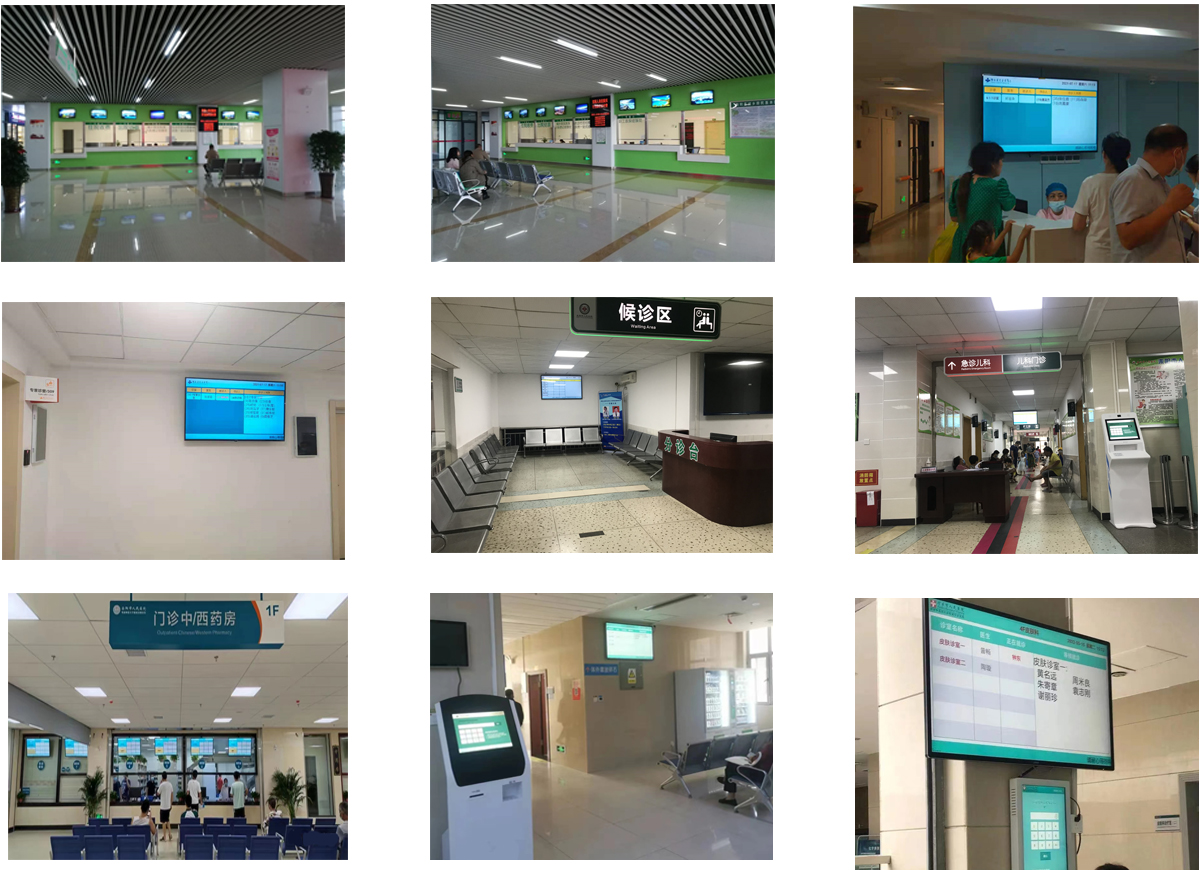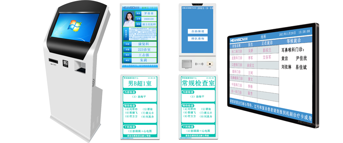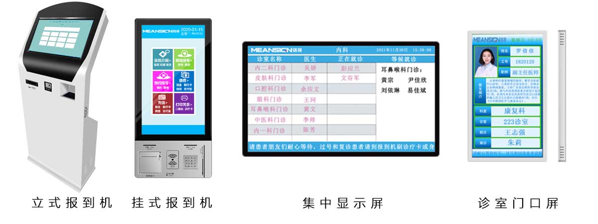 醫療叫號系統所使用的硬件設備包括:自助報到機、診室門口屏、集中顯示屏、醫生排班顯示屏、自助取單機等,其中診室門口屏有15.6、18.5、21.5、23、27等尺寸,集中顯示屏有32、43、49、55、65、75、85、100等尺寸,報到機支持壁掛和立式兩種,可增加二維碼掃描模塊、小票打印機模塊、刷卡模塊、身份證識別模塊、攝像頭模塊等外設。